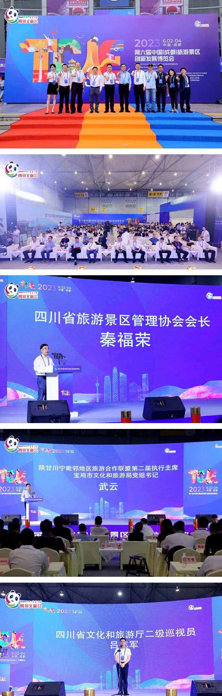 大会**项由主要嘉宾依次致辞。首先由四川省旅游景区管理协会会长秦福荣会长致辞;其次是由陕甘川宁毗邻地区旅游合作联盟第二届执行主席、宝鸡市文化和旅游局党组书记武云致辞;而后由展会的承办单位成都市天一展览服务有限公司总经理朱江龙先生介绍文旅会总体情况,最后由四川省文化和旅游厅二级巡视员吕志军宣布博览会开幕。
