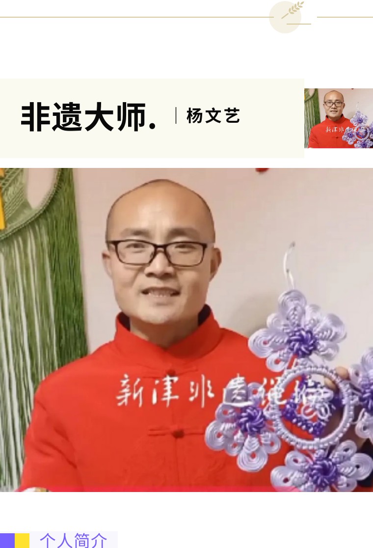 成都市杨文艺绳编技能大师工作室:2019年10月,成都市正式授牌“成都市杨文艺绳编技能大师工作室”,以绳编非遗传承人杨文艺为首席技能大师,工作室包括绳编,棕编,糖画,剪纸,衍纸,面塑,钩编等民间非遗项目,为推动新津文化大发展大繁荣,为新津非遗保护传承创新不断努力做出应有的贡献。