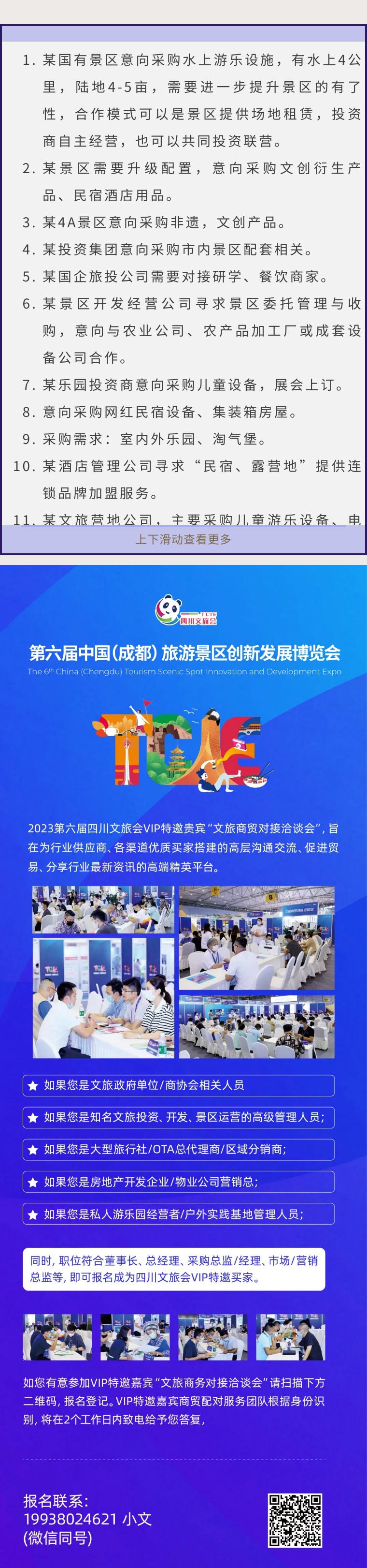 第六届中国(成都)旅游景区创新发展博览会现场上,将由专人引导核心买家团队到对口展商展位上,提升现场或者潜在的合作率。还将提供VIP洽谈区,实现展商与核心买家零距离的沟通洽谈。